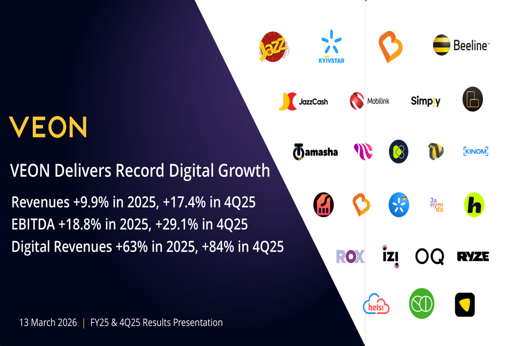 VEON Ltd. provides telecommunications and digital services in Pakistan, Ukraine, Kazakhstan, Bangladesh, and Uzbekistan. The company offers mobile telecommunications services under prepaid and postpaid subscriptions, including value-added and call completion services, national and international roaming services, wireless Internet access, mobile financial services, and mobile bundles; fixed-line telecommunications using fiber optic networks; cross-border transmission services; prepaid scratch cards and electronic recharge options; mobile services on 2G, 3G, and 4G/LTE networks; cloud solutions, including consumer storage apps; local, long-distance, and international voice services; and customer support through contact centers. It also provides FikrFree, a digital insurance marketplace; Tamasha, a video streaming app; ROX, a digital lifestyle brand; Garaj, a cloud platform; ApnaClinic and Helsi digital healthcare platforms; SIMOSA, ZARR, and RYZE lifestyle platforms; Kyivstar TV, a media streaming service; My Kyivstar, a self-service application; Uklon, a ride-hailing and delivery platform; Adwisor, an adtech platform; Simply, a mobile-only neobank; BeeTV, an entertainment platform; Hitter and riitm music streaming platforms; MyBL, Janymda, and Hambi super-apps; AI tutor, an AI-powered learning assistant; Toffee, an infotainment platform; BCloud, a digital infrastructure solution; Beepul, a financial services solution; KINOM, a digital entertainment platform; BeeMarket, an electronics and home appliance marketplace; Hambi Davo, a suite of digital health services; and OQ, a digital platform. The company distributes its products and services through a direct sales force, franchises, third-party retailers, distributors, supermarkets, stores, chains, online, offices, and other channels. The company was formerly known as VimpelCom Ltd. and changed its name to VEON Ltd. in March 2017. VEON Ltd. was founded in 1992 and is headquartered in Dubai, the United Arab Emirates.